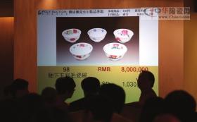 6月20日,香港,湘繡湘瓷藝術(shù)精品拍賣會現(xiàn)場,備受關(guān)注的釉下五彩毛瓷碗(一套五件)以1168.4萬港幣的價格成交!D/新華社
