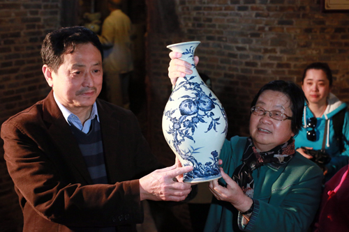 故宮博物院古陶瓷專家葉佩蘭(右)和文物研究員周榮林展示復(fù)燒成功的清代雍正青花桃蝠紋橄欖瓶。(記者王東 攝)