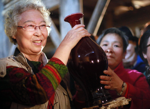 來自遼寧鞍山的游客杜金蘭女士高興地舉起剛出窯的瓷器拍照留念。(記者王東 攝)