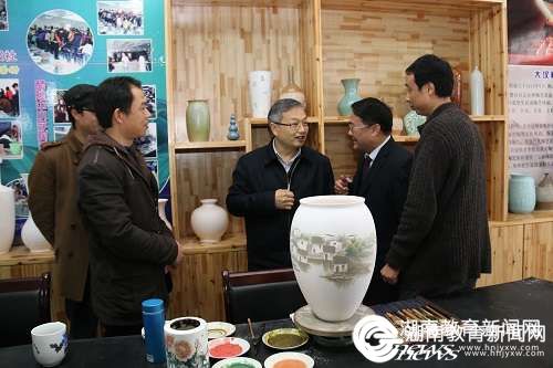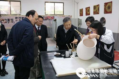 王廳長(zhǎng)一行首先視察了校園環(huán)境,對(duì)學(xué)校一流完善的辦學(xué)條件很是滿意。在學(xué)校大漢陶瓷體驗(yàn)館,王廳長(zhǎng)觀看了陶瓷大師們的精彩創(chuàng)作過(guò)程,不時(shí)與大師們進(jìn)行親切交談,熱情地詢問(wèn)大師們一些問(wèn)題?吹酵瑢W(xué)們正認(rèn)真地創(chuàng)作非常美麗的陶瓷作品時(shí),王廳長(zhǎng)對(duì)他們進(jìn)行了高度的贊揚(yáng),不斷地鼓勵(lì)他們勤學(xué)苦練、立志志才。他對(duì)醴陵陶瓷興趣濃厚,在國(guó)瓷展廳,對(duì)琳瑯滿目的國(guó)瓷展品給予了高度的評(píng)價(jià),表示今后一定會(huì)更多地了解醴陵陶瓷文化、陶瓷歷史。