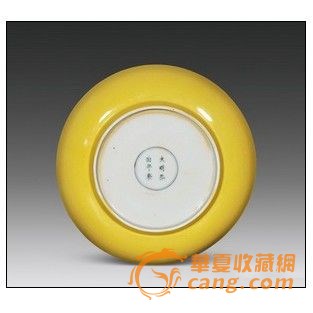此收藏品是"大明弘治年制"款,盤直口弧壁,底微凹,圈足內(nèi)收,通體施黃釉,足內(nèi)白釉閃青,里心青花書(shū)"大明弘治年制"六字雙行楷書(shū)款。