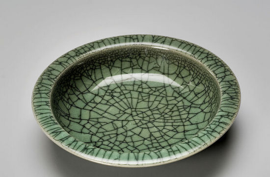 其二、"金絲鐵線"的紋樣,哥窯釉面有網(wǎng)狀開片,或重疊猶如冰裂紋,或成細(xì)密小開片("俗成百圾碎"或"龜子紋"),以"金絲鐵線"為典型,即較粗琉的黑色裂紋交織著細(xì)密的紅、黃色裂紋。明代《格古要論》中有這樣的描述:"哥窯紋取冰裂、鱔血為上,梅花片墨紋次之。細(xì)碎紋,紋之下也。"
