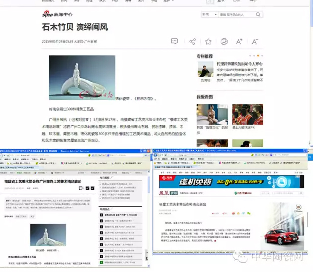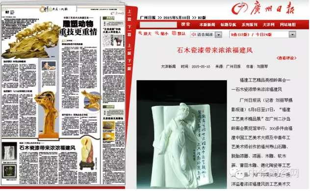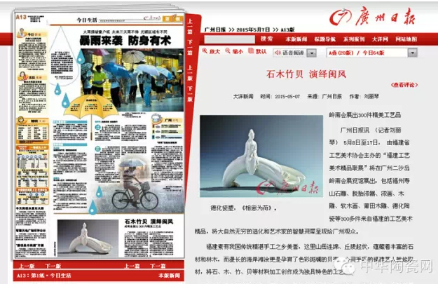 當(dāng)代德化陶瓷名家精品展”與“福建工藝美術(shù)精品聯(lián)展”已連續(xù)三屆的成功舉辦,不僅贏得了各界的青睞,也為德化陶瓷及福建工藝美術(shù)精品搭建起了一個(gè)集展示、交流及流通的良好平臺(tái)。還獲得各界媒體的關(guān)注,廣州日?qǐng)?bào)、新浪網(wǎng)、信息時(shí)報(bào)、中華陶瓷網(wǎng)等媒體都報(bào)道了本次聯(lián)展,鳳凰網(wǎng)、網(wǎng)易新聞、雅昌新聞、環(huán)球網(wǎng)、東方網(wǎng)、天津網(wǎng)、中國日?qǐng)?bào)網(wǎng)、21CN等幾十家媒體轉(zhuǎn)載報(bào)道。同時(shí)中華陶瓷網(wǎng)及官方微信平臺(tái)集中對(duì)本次活動(dòng)進(jìn)行跟蹤連續(xù)報(bào)道,并對(duì)展出的作品進(jìn)行分期欣賞展示。