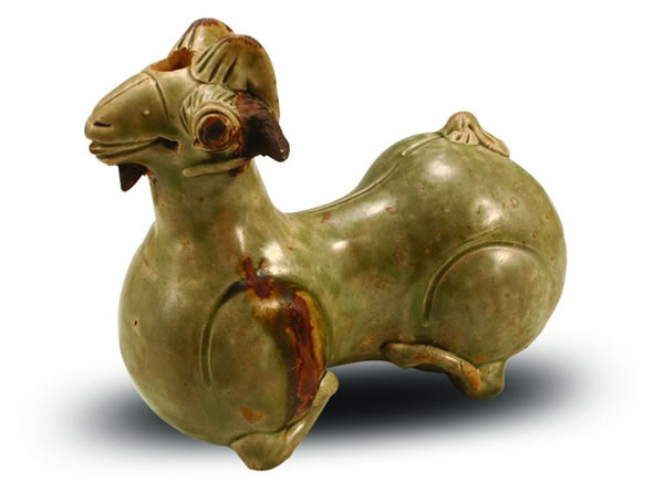 1980年鎮(zhèn)江市諫壁磚瓦廠東晉墓出土越窯青釉點彩羊形燭臺(圖3),高14.7厘米,長17厘米。羊作跪伏狀,昂首張口,雙耳長伸,卷角后彎,下顎貼塑胡須,臀部上端貼印短尾,頭頂有一圓孔,中空,用以插燭。胎灰白色,釉色瑩潤,眼睛、耳朵、肌肉突出部點有褐彩,起到了畫龍點睛的藝術效果,為越窯青瓷中的精品。羊形燭臺曾被認為是插物的插座,它的造型與河北省滿城中山國王劉勝墓出土的銅羊燈一模一樣,唯一的區(qū)別是銅羊燈的羊背可以翻轉擱在羊頭上作燈盞,瓷羊的額部鏤一孔,用以插燭,兩者的照明點都在羊頭上。