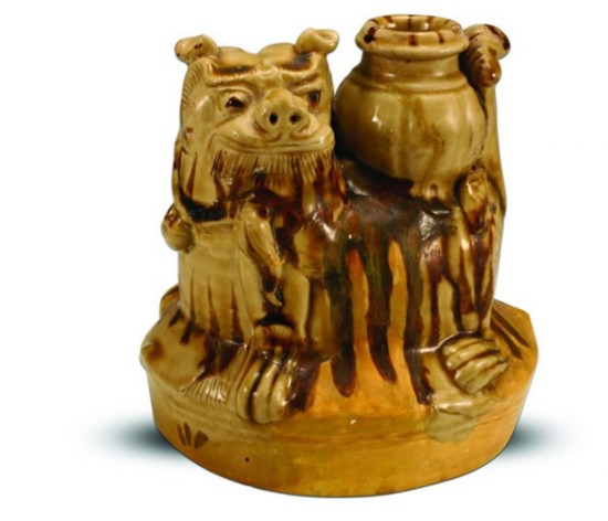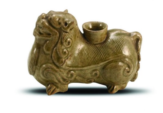 1973年鎮(zhèn)江丹徒縣華墅公社西晉墓出土的越窯青釉獅形燭臺(圖1),高9.3厘米,長12.5厘米。張口,露齒,垂須,四肢伏地,長尾,背部有管狀插孔。背部刻劃鬃毛,腹兩側刻劃卷毛紋。胎淺灰色,全器施釉,釉層均勻,釉色滋潤,透明度高。獅形燭臺過去定為“水注”,認為是盛水的文具。1993年南京上湖孫吳墓出土一件獅形燭臺,在插管內(nèi)尚存一截白蠟;1975年紹興縣上游公社長紅大隊黃公山出土一件南朝時期的獅形燭臺,獅首向左上方回顧,尾巴上豎,四肢伏地,背部負方座,座上挑長方形橫梁,梁面置并列的三個圓筒形管,管徑上大下小,平底,與器腹不通,是用以插燭的燭臺,說明這類器物不是水注,而是照明用的燭臺。