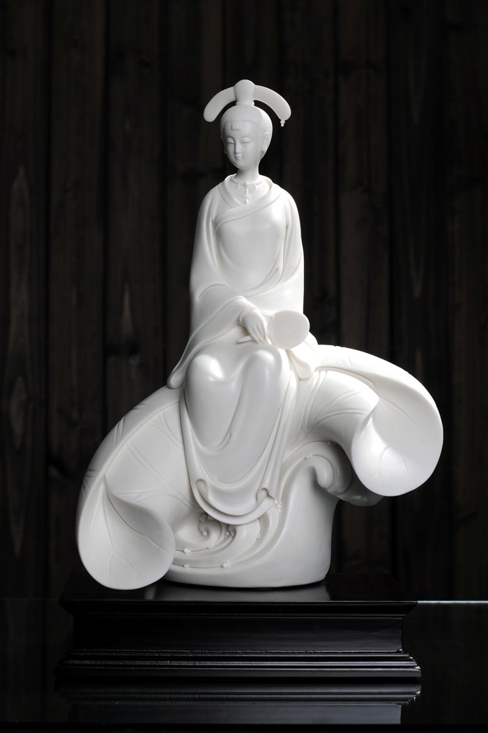 簡介:水浪造型的底座,卷曲的荷葉,一女子端坐其上,手持小扇,低頭似在凝望荷塘月色。整件作品立意新穎,造型優(yōu)美,作品手刻簽名。