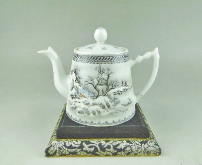 江邊看“寒江晚渡”。圖一是一只民國時(shí)期的雪景壺,和現(xiàn)在用的燒水壺有些類似,有壺把和壺嘴,壺高10厘米,口徑6.5厘米,身長14.3厘米。這種壺有壺把可以手執(zhí),因此在古代也叫“執(zhí)壺”。壺身施以粉彩,展示的正是冬天的傍晚,降雪之后,寒江晚渡的情形。如果身臨其境,站在江邊,只見江天連成一片,迷迷蒙蒙,雪白茫茫,飛雪仍在緩緩飄落,四周一片凄迷。一只孤舟由江心緩緩駛向江岸。江邊的老樹上,枯草上,房頂上都落了雪,小徑被雪覆蓋,沒了道路,只有行人深深淺淺的腳印,走向遠(yuǎn)方。壺的另一邊有題款:“寒江晚渡照塔影”,“時(shí)在乙酉冬月,凌云作”。凌云字美材,齋名凌云軒,江西新建人,是清末民初很有名望的粉彩畫家,與“珠山八友”之首的王琦是同鄉(xiāng)而且私交甚好,頗受其影響。