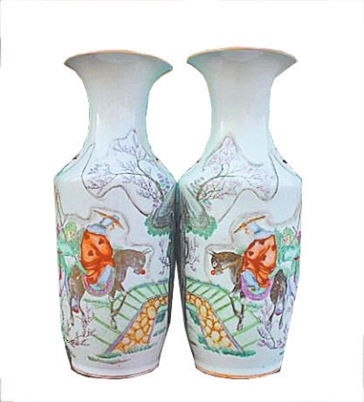 橋邊看“紅梅映雪”。圖二是一對(duì)民國時(shí)期的粉彩棒槌瓶,敞口,細(xì)頸,豐肩,圈足,因呈棒槌狀而得名。瓶高58厘米,口徑21厘米,底徑18厘米,瓶上的圖景是著名的“踏雪尋梅”圖。“踏雪尋梅”源自唐代詩人孟浩然,元代的劇作家費(fèi)唐臣在《貶黃州》中有“為生扭做踏雪尋梅孟浩然”之句,正是說