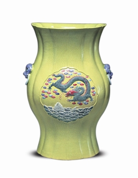 清光緒綠地魚龍圖花式瓶,高51.6厘米。高又厚的大瓶,卻有個(gè)婀娜的八瓣花形身軀,上頭還滿布鮮艷的黃綠色釉。器身兩側(cè)貼塑獸耳銜環(huán),腹部前后有菱花式開光,框欄里浮雕魚龍圖,五爪龍遨游彩云間,鯉魚從波濤中躍出,帶魚躍龍門、出人頭地的吉祥意義。