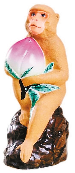 其一,猴子獻(xiàn)桃象征長壽。這件“金猴獻(xiàn)壽”是景德鎮(zhèn)工藝大師張育賢的作品。作品中一只靈猴身坐仙山福地上,手捧著鮮艷無比、碩大水靈、香氣馥郁的仙桃。桃為五木之精,傳說仙境中生長的桃樹,三千年一結(jié)果,結(jié)出仙桃是增壽的瑞果。此件器物釉色恰到好處地表現(xiàn)出猴子身上的茸毛以及炯炯有神的目光。作品栩栩如生、動(dòng)感十足,以寫實(shí)造型手法賦予了靈猴深邃的文化底蘊(yùn)和現(xiàn)代瓷雕藝術(shù)的審美價(jià)值,以全新的陶瓷藝術(shù)語言表達(dá)了“新春納福、金猴獻(xiàn)壽”的吉祥祝福。
