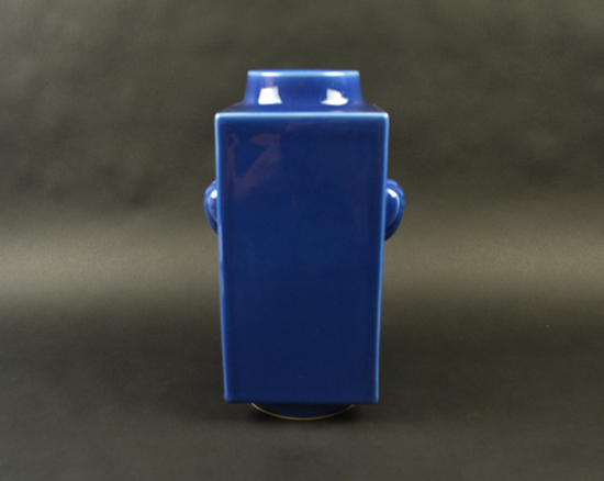 民國祭藍釉象耳瓶,高29.8cm,此瓶圓口方身圈足,仿玉琮制式,腹上部兩側貼飾雙象形耳,象鼻銜環(huán),雕刻精致。造型周正,端凝敦厚,靜穆古樸。體量適宜,制器嚴謹,比例均衡,線條利落簡潔,考究端莊。通體施祭藍釉,釉色純正,晶瑩亮澤,釉質純凈,色澤深沉,釉面不流不裂,色調濃淡均勻,呈色較穩(wěn)定。釉色藍如深海,釉面勻凈,口沿、瓶棱角邊緣色淺。象耳方瓶是乾隆朝開始流行的一種瓶式,自燒造之時直至晚清,歷代官窯都有生產,是清代官窯的傳統(tǒng)品種。因器形方正,瓶側飾象耳,故又有“太平有象”之吉祥寓意。底書“大清乾隆年制”款。