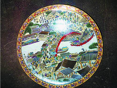 “梨花風(fēng)起正清明,游子尋春半出城。日暮笙歌收拾去,萬株楊柳屬流鶯。”這是南宋詩人吳惟信的《蘇堤清明即事》,宋朝的繁華從中可窺一斑。當(dāng)然,宋朝的民俗風(fēng)還要看北宋畫師張擇端的《清明上河圖》。圖4是一只清代乾隆年間的琺瑯彩盤,直徑35.1厘米,圖案便是“清明上河”之再現(xiàn)。只見紅綠鮮明,房屋錯落有致,人物并行不悖,清晰可見,真是美輪美奐。左上角有“清明上河圖,大宋宮廷畫家、翰林大學(xué)士張擇端”,底部有“大清乾隆年制”的字樣。