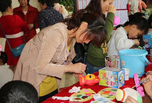 筆者看到,嘉賓們都仿佛變身藝術(shù)家一樣,一手拿著畫(huà)筆,一手托著調(diào)色板。面對(duì)著陶瓷娃娃,一筆一筆描繪出象征活力與熱情的繽紛色彩。只見(jiàn)喜洋洋、悠悠豬、叮當(dāng)貓、紅太郎、灰太狼……形象各異、妙趣橫生的陶瓷娃娃形象,在嘉賓們靈巧的雙手下逐漸成型。一些小嘉賓的手上更是沾上了五顏六色的色彩,煞是好看。濃厚的藝術(shù)氛圍伴隨著家長(zhǎng)與孩子歡快的交談與爽朗的笑聲,一幅幅幸福溫馨的畫(huà)面呈現(xiàn)在了人們的面前。