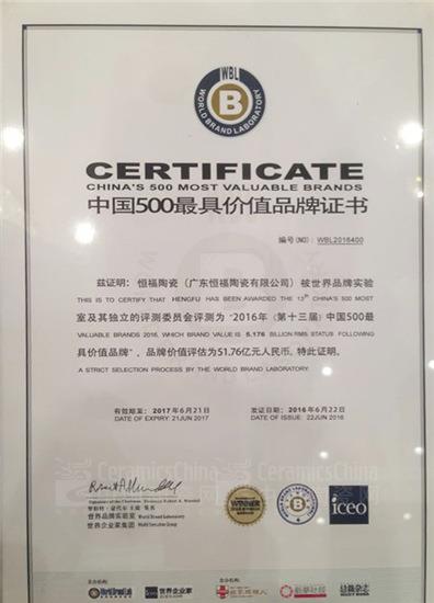 恒福陶瓷連續(xù)3年入選中國500最具價值品牌榜,這與恒福十六年如一日堅持品質(zhì)致勝和創(chuàng)新發(fā)展密不可分,也是恒福在品牌建設(shè)上堅持不懈的大膽投入、循序漸進和厚積薄發(fā)的結(jié)果。自2014年首次入選中國500最具價值品牌榜后,恒福陶瓷品牌價值從首次的36.65億元,到2015年的43.79億元,再到今年的51.76億元,品牌價值迅速飆升,向世人展示了恒福陶瓷奮發(fā)進取、強勢崛起的形象。