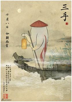 三手,三足渡者,背有天眼,手撐一櫓駕龍舟于云海,聞核桃之音接送過(guò)客往來(lái)如升樓。