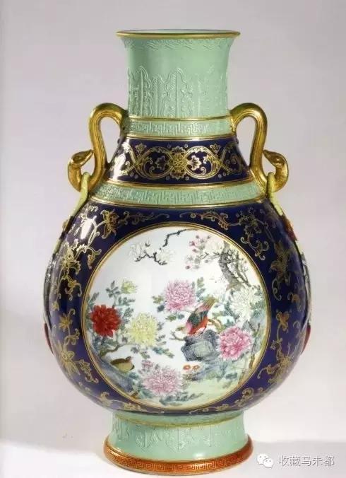 霽藍(lán)描金開光粉彩花鳥暗刻松石綠釉如意雙耳尊