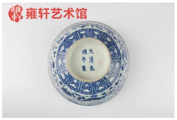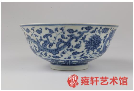 雍軒藝術(shù)館最近有幸征集到一款大清光緒款“青花纏枝花卉龍紋碗”,藏品高:8.5cm,口徑:20cm。藏品通體飾以青花,胎土精細(xì),釉汁均凈,造型工整,凝重渾厚,胎質(zhì)細(xì)膩,細(xì)砂底,整體風(fēng)格是雄偉渾厚,莊重古樸。裝飾手法豐富,繪畫講究恢宏壯闊,具有很強(qiáng)的藝術(shù)感染力。碗身上纏枝花卉描繪得非常流暢,線條粗獷,自由活潑,畫法布局根據(jù)器型講究變化,青花云龍紋畫工展現(xiàn)夔龍靈活多變又有靈氣的規(guī)律性,顯示了當(dāng)時裝飾藝術(shù)的高超及繪畫功力的嫻熟。