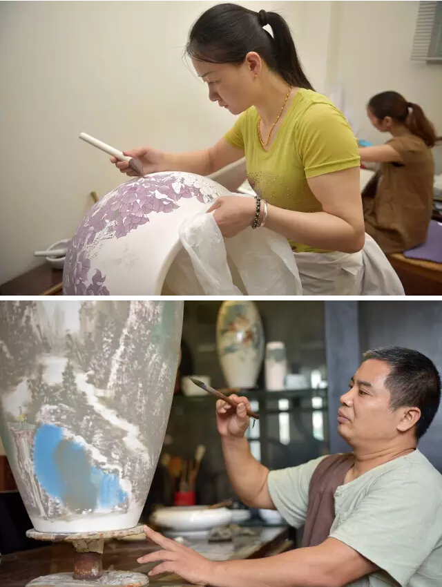 7月盛夏的一天,我們一入醴陵,就直奔耗資6000萬元建設的新世紀陶瓷藝術館,進到藝術館一樓,就見一排大師工作室里面,陶瓷大師們正一個個在素胎上凝神屏氣地創(chuàng)作,藝術氣氛立刻變得氤氳起來。