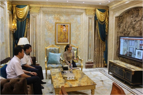 當天下午,徐金鵬社長一行人參觀了結(jié)合云商平臺打造的歐神諾陶瓷新展廳,體驗了全新的消費模式,并與歐神諾的董事長鮑杰軍進行了座談。