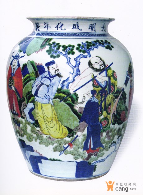 五彩瓷始興于明宣德,在嘉靖、萬歷時(shí)期最負(fù)盛名,色彩以紅、綠、黃、褐、紫及釉下青花為主,以圖紋繁密、色調(diào)濃艷而聞名。這件器物色彩分明,山峰的青綠,顯示出植被的青翠;人物服飾的迥異,又突出了人物身份的不同。與明代五彩不同的是,在五彩中加入了濃重沉著的墨彩,具有典型的清代風(fēng)格。根據(jù)主題紋飾紅彩、黃彩、綠彩的呈色和底部圈足的特征來看,這件五彩水滸人物故事罐應(yīng)為清中期燒制。