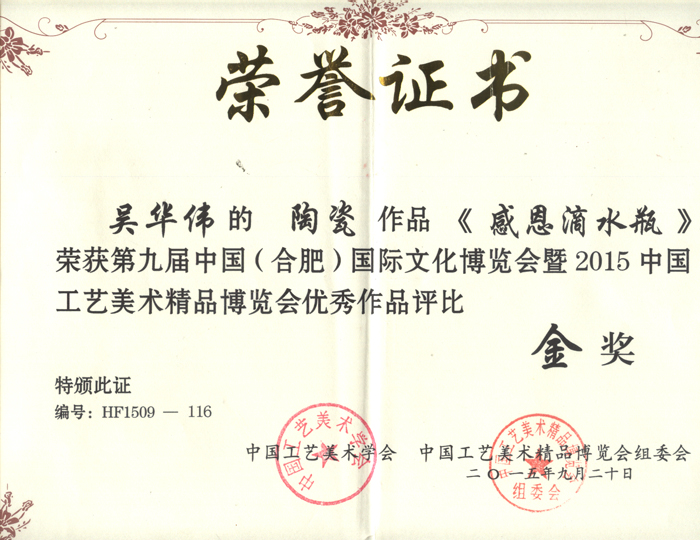 2015年9月18日,第九屆中國(guó)(合肥)國(guó)際文化博覽會(huì)在安徽合肥舉行。展會(huì)期間,中國(guó)工藝美術(shù)學(xué)會(huì)組織開(kāi)展了第九屆中國(guó)(合肥)國(guó)際文化博覽會(huì)暨2015中國(guó)工藝美術(shù)精品博覽會(huì)優(yōu)秀作品評(píng)比活動(dòng),一件陶瓷作品《感恩滴水瓶》在本屆展會(huì)上格外引人注目,它以釉色典雅,開(kāi)片唯美受到評(píng)委的一致好評(píng),獲得了本次博覽會(huì)的金獎(jiǎng)。