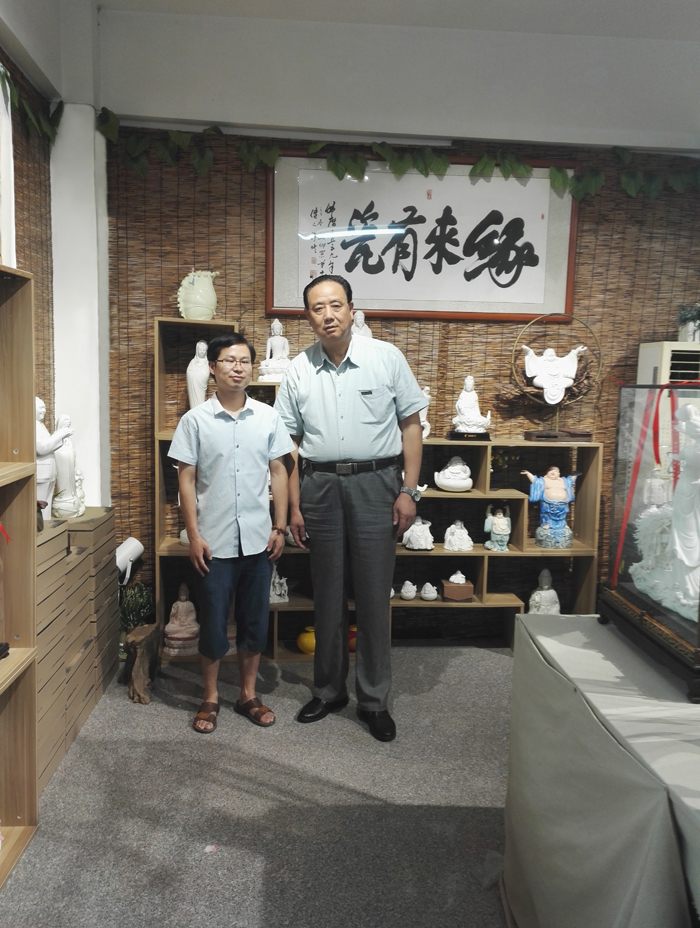 2016年9月6日中國陶瓷藝術(shù)文化發(fā)展中心主任周含良蒞臨參觀中華陶瓷網(wǎng)及博緣陶瓷,實地考察中國陶瓷藝術(shù)文化發(fā)展中心德化分中心工作開展情況并和中華陶瓷網(wǎng)總經(jīng)理柯維太親切合影。
