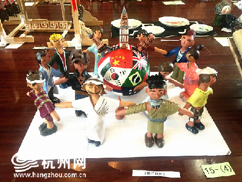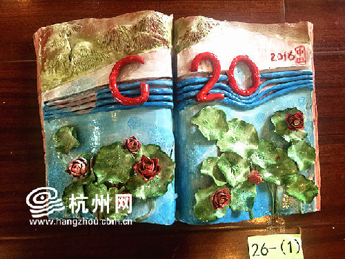 學(xué)生們通過一塊塊平凡的泥土,用自己的一揉一捏,在火的錘煉下幻化成意趣生動(dòng)的陶藝作品,不少作品都充滿著各種中國元素、杭州民俗,如民族藝術(shù)、傳統(tǒng)節(jié)日、西湖美景、百姓生活等等,寄托了學(xué)生對G20的美好期待。就如一等獎(jiǎng)作品《舌尖上的中國》,主題圍繞杭州飲食文化,用泥土的質(zhì)感和熟練的技巧將杭州特色美食小籠包,及傳統(tǒng)節(jié)日美食——中秋月餅、端午粽子表現(xiàn)的活色生香。這幅作品展出以來就成為了焦點(diǎn),受到了“明星”待遇,栩栩如生的刻畫還勾起了不少參觀者的食欲。此外,西湖荷花、三潭印月、飲茶等杭州元素與埃菲爾鐵塔、峰會(huì)20國國旗、各國人物等世界文化的結(jié)合,充滿奇思妙想的作品都表達(dá)出小作者對G20杭州峰會(huì)的美好憧憬。