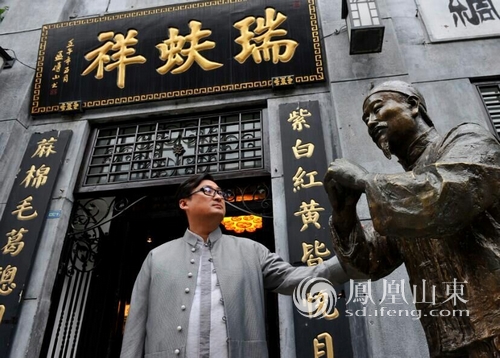 下午,鳳凰全媒體走進(jìn)周村大街,體驗(yàn)古代商業(yè)街文化,探尋魯商源地時,恰逢孟洛川第五代孫孟慶鋼在周村大街新開了一家“孟洛川”旗袍訂制門店,位置就在瑞蚨祥老號里。