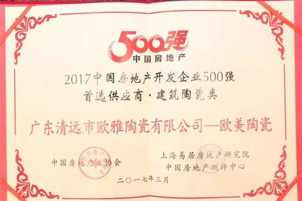 恭喜歐美陶瓷再度榮膺“2017中國房地產(chǎn)開發(fā)企業(yè)500強首選供應商”稱號