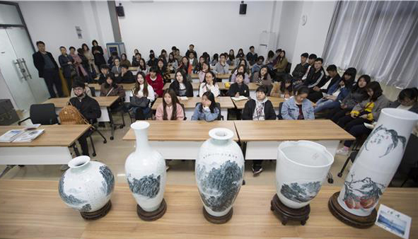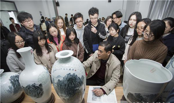 2017年3月27日,在南京林業(yè)大學(xué)藝術(shù)設(shè)計學(xué)院,畫家劉越勝為大學(xué)生們講述畫青花的體會。當(dāng)日,南京林業(yè)大學(xué)藝術(shù)設(shè)計學(xué)院舉辦學(xué)術(shù)講座,首次邀請畫家為大學(xué)生們講述畫青花的體會,讓大學(xué)生們近距離了解“瓷以畫傳,畫以瓷傳”的無窮魅力。