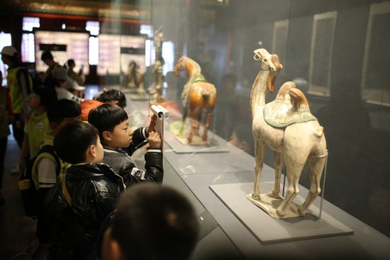 在陶瓷館內(nèi),解說(shuō)員告訴孩子們關(guān)于陶瓷的各種小知識(shí),例如陶和瓷有何不同,被譽(yù)為“瓷母”的各色釉大瓶有何獨(dú)特之處,“唐三彩”是給逝者使用的冥器等等。在參觀完多個(gè)展品后,孩子們分為男生女生兩組,比賽用最短時(shí)間拼好“唐三彩”及“瓷母”兩幅拼圖。