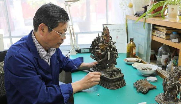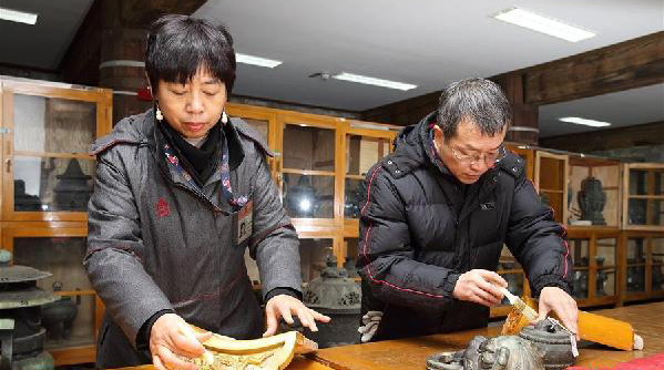 故宮工作人員修復(fù)文物(資料照片)。故宮博物院經(jīng)過三年藏品清理工作,增加了55132件登記藏品,涉及乾隆御稿、尺牘、甲骨、陶瓷等種類文物、標本。這些新“上戶口”的藏品已于3月15日起在延禧宮展覽