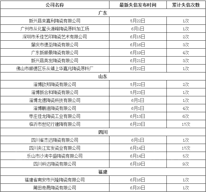 7月1日,記者根據(jù)最高人民法院及各地法院發(fā)布的失信被執(zhí)行人信息,統(tǒng)計了5月11日—6月30日這51天內(nèi)全國各地被列入“失信被執(zhí)行人”的陶企,14個省份的30余家陶瓷企業(yè)被列入了“老賴”名單。