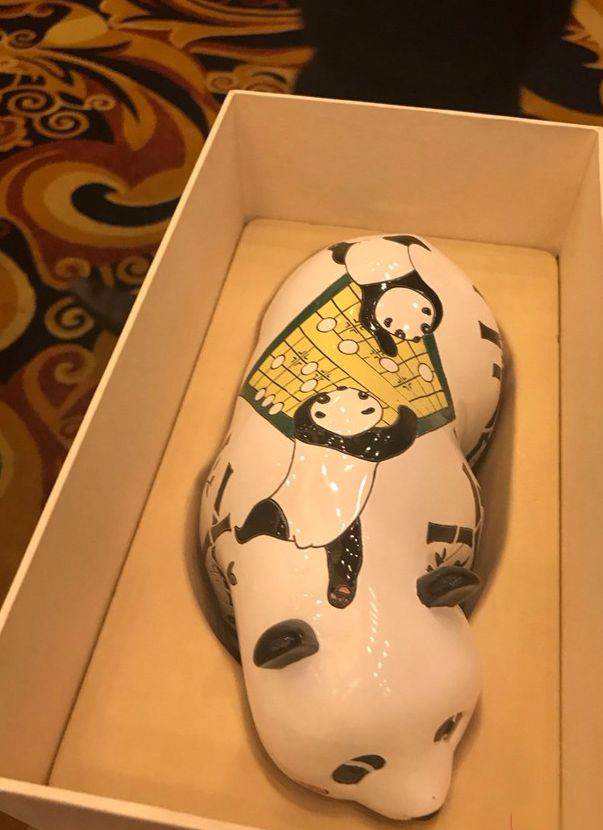 會見結(jié)束后,成都給祖拉布送上一份特別的禮物——一只陶瓷熊貓和一條熊貓蜀錦。記者看見,陶瓷熊貓上還繪制了圍棋和竹子。當(dāng)然,祖拉布也給成都帶了回禮——一瓶具有當(dāng)?shù)仫L(fēng)味的伏特加。成都市旅游局局長多央娜姆告訴記者,之所以選擇陶瓷熊貓和蜀錦,是因為它們具有成都特色。