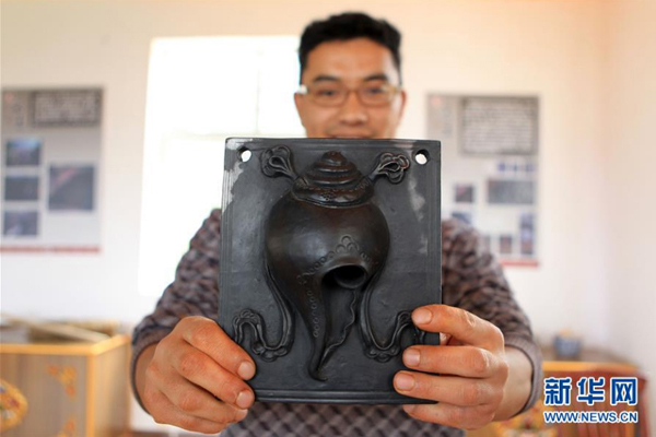 25歲的拉茸肖巴在湯堆村非遺展示區(qū)展示其制作的藏族黑陶(2017年9月12日攝)。 新華社記者 井輝輝 攝