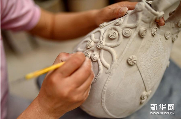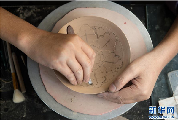 內(nèi)丘縣制瓷人員在邢白瓷坯體上刻花(2016年7月12日攝)。新華社記者 牟宇 攝