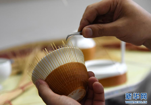 景德鎮(zhèn)瓷胎竹編第五代傳人張三石在進(jìn)行瓷胎手工竹編(2017年6月26日攝)。 新華社記者 張瑞琪 攝