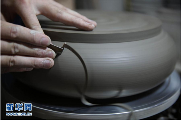 在河南省寶豐縣一家汝瓷廠,汝瓷藝人在修坯(7月17日攝)。新華社發(fā) 何五昌 攝