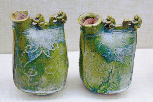 葉茂臺遼瓷窯址先后出土的陶瓷制品近百件,有南方和河北燒制的影青、青瓷、定窯白瓷等,也有遼土燒制的白釉三彩瓶、米黃釉綠彩劃花盆、印花梅瓶等。其中最有遼瓷特點的雞冠壺也出土多件,如白釉環(huán)梁雞冠壺、醬釉雙孔帶蓋雞冠壺等。