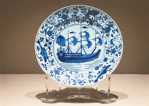 此次展出的清乾隆青花帆船圖花口盤就是外銷瓷中的精品。該盤既有“連生貴子”的中式紋樣,又有“中西結(jié)合”的三桅帆船,不僅具有極高的藝術(shù)價(jià)值,而且真實(shí)地反映古代航海和瓷器貿(mào)易歷史,有珍貴的史料價(jià)值。