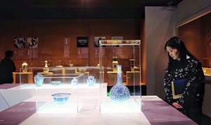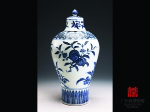 據(jù)策展人朱鐵權(quán)介紹,粵博館藏明清青花瓷器數(shù)量眾多,珍貴文物達千余件,器型多樣,紋飾精美。本次精選160余件(套),從三個層面進行展示。在“文化瓷韻”板塊,通過紋飾、器型等展示明清青花瓷器特有的文化韻味。“明嘉靖款青花壽字葫蘆瓶”很有代表性,束腰葫蘆形,腹部主題紋飾為梅、竹、仙鶴、鹿及雙壽字等。據(jù)介紹,嘉靖官窯青花使用的是“回青”青料,藍中帶紫,濃重艷麗。