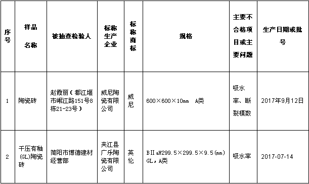 2017年4季度墻地磚商品質(zhì)量抽查檢驗不合格商品及被抽檢人、生產(chǎn)企業(yè)名單