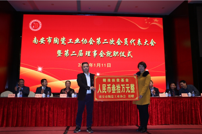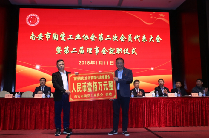 會議期間,南安市陶瓷工業(yè)協(xié)會向官橋鎮(zhèn)社會治安綜合治理基金會捐贈100萬元、向“萬賢扶千戶” 精準扶貧行動捐贈30萬元。充分體現(xiàn)出回報社會的企業(yè)家精神。
