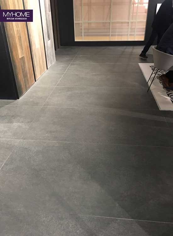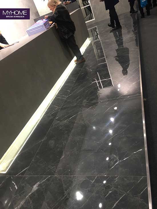 展廳咨詢臺前的地面由 120×120cm 大規(guī)格方磚鋪成,就象黑色的緞面上撒了一層銀燦燦的綢帶,給人一種穩(wěn)重和高貴的感覺,大面積鋪貼體現(xiàn)出其特有的富麗堂皇。