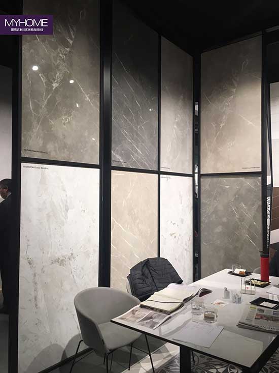 在大理石瓷磚展示區(qū),90×180 cm、120×120 cm 兩種規(guī)格全系列產(chǎn)品赫然在列。棕色、褐色、杏色、等溫暖、淡雅的大地色系,時(shí)尚優(yōu)雅之余,也為家居空間帶來心理上的輕松和幸福感。