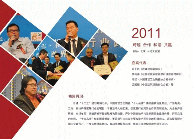 享有陶瓷行業(yè)的“百花獎”美譽的中國建筑衛(wèi)生陶瓷十大品牌榜評選活動,每一年的活動現(xiàn)場都有陶業(yè)的大咖出席。如,2011年時任中國建筑衛(wèi)生陶瓷協(xié)會秘書長,現(xiàn)任中國建筑衛(wèi)生陶瓷協(xié)會常務(wù)副會長繆斌;2012年佛山市歐神諾陶瓷股份有限公司董事長鮑杰軍;2013年中國建筑衛(wèi)生陶瓷協(xié)會副秘書長尹虹博士;2015年佛山市簡一陶瓷有限公司董事長李志林等。