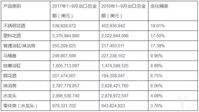 2017年1~9月非陶瓷衛(wèi)浴代表產(chǎn)品出口變化情況