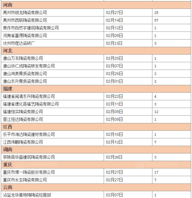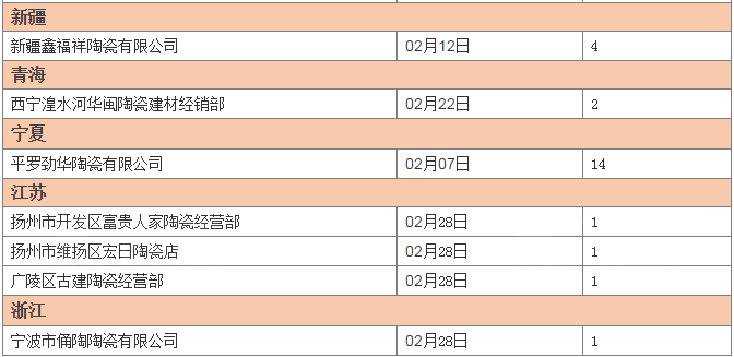3月1日,記者根據(jù)最高人民法院及各地法院發(fā)布的失信被執(zhí)行人信息統(tǒng)計,2018年2月份有40余家陶企被列入“失信被執(zhí)行人名單”。據(jù)悉,2月份的名單涉及15個省(市),廣東省失信陶企最多,高達14家。