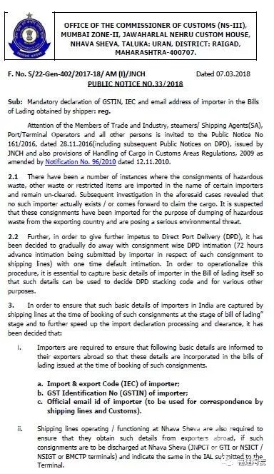 2018年4月1日開始,印度海關(guān)將實施新的通關(guān)要求,外貿(mào)貨代企業(yè)需嚴(yán)格執(zhí)行,否則貨物運(yùn)抵目的港后將無法清關(guān),同時面臨海關(guān)處罰!
