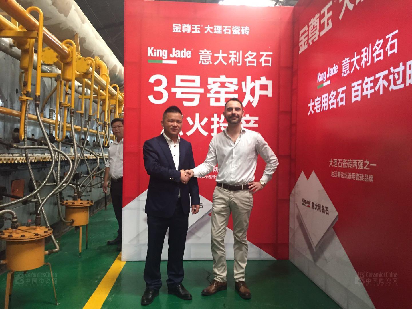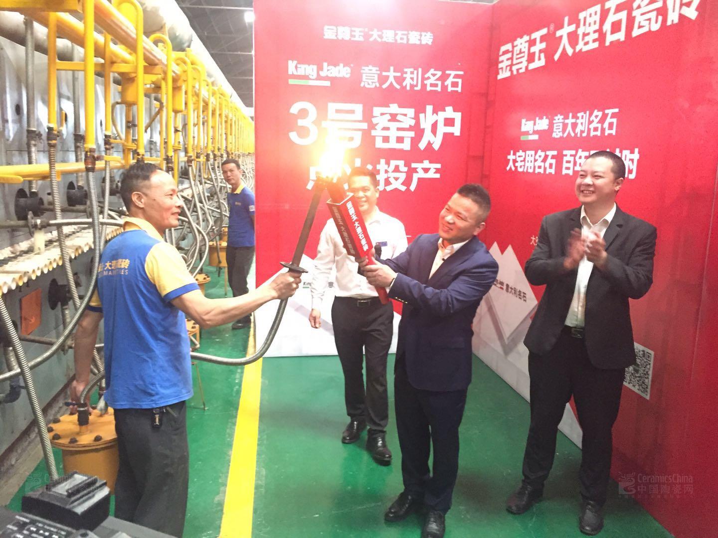 2018年3月28日,在金尊玉西樵生產(chǎn)基地,金尊玉大理石瓷磚董事長(zhǎng)南順芝攜意大利天工法拉利集團(tuán)代表人員在行業(yè)主流媒體的見證下舉行3號(hào)窯爐點(diǎn)火投產(chǎn)的點(diǎn)火儀式。這意味著金尊玉新一代大理石瓷磚生產(chǎn)線火紅開窯。同時(shí)也意味著,作為中國(guó)第一家引進(jìn)綠色工廠智能化儲(chǔ)坯系統(tǒng)的金尊玉,正式開啟自動(dòng)化生產(chǎn)。